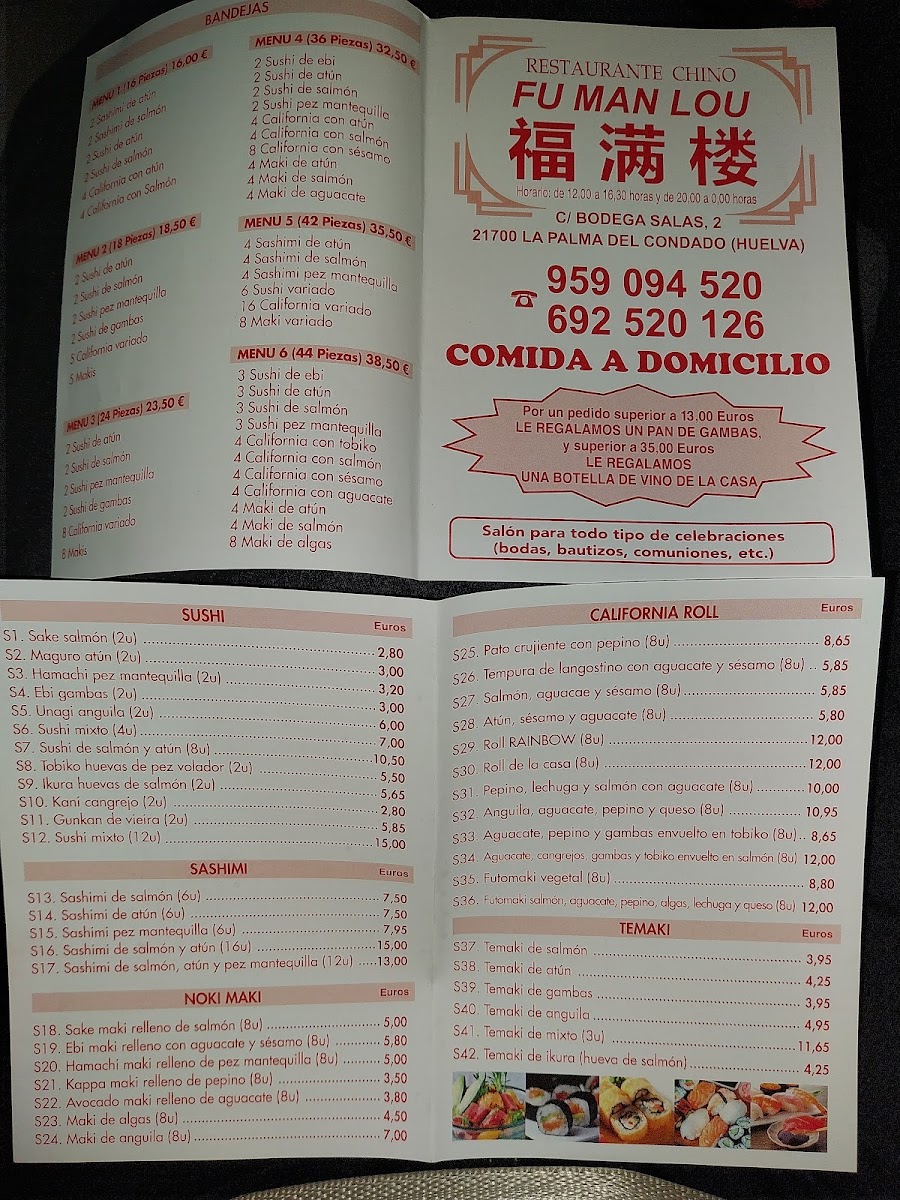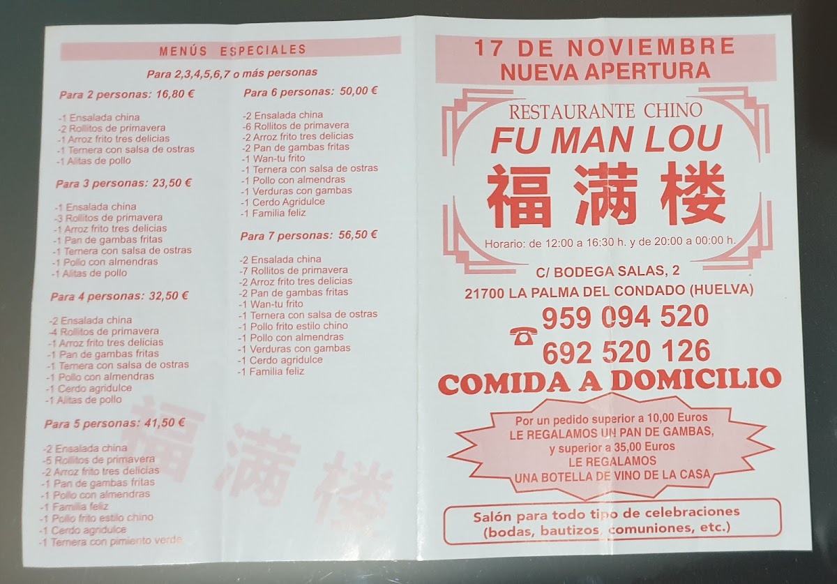 Welcome to Restaurante Chino Fu Man Lou, a hidden gem located at C. Bodega Salas, 2 in La Palma del Condado, Huelva. Known for its accessibility and ample parking, this establishment offers a casual dining atmosphere perfect for quick meals or takeout.